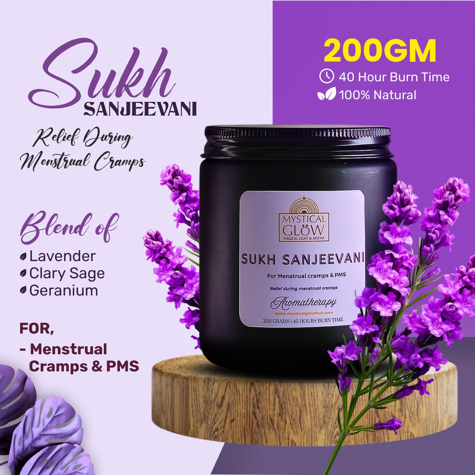 Sukha Sanjeevani aromatherapy candle creates a therapeutic environment that supports natural menstrual wellness through scientifically-studied essential oils. The following benefits reflect the ambience-enhancing properties of lavender, clary sage, and geranium aromatherapy—intended for environmental support only, not as medical treatment or cure. Always consult gynecologists for severe or persistent menstrual conditions.